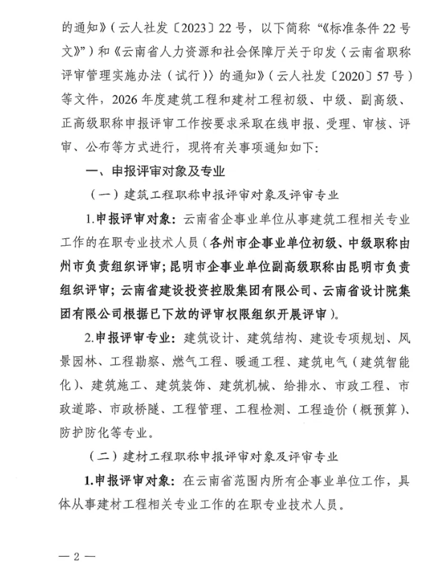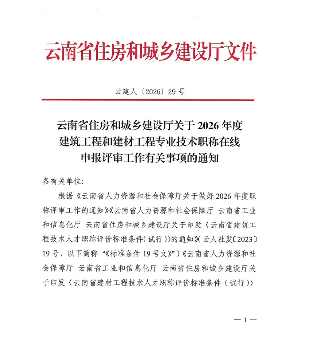 云南省住房和城乡建设厅关于2026年度建筑工程和建材工程专业技术职称在线申报评审工作有关事项的通知