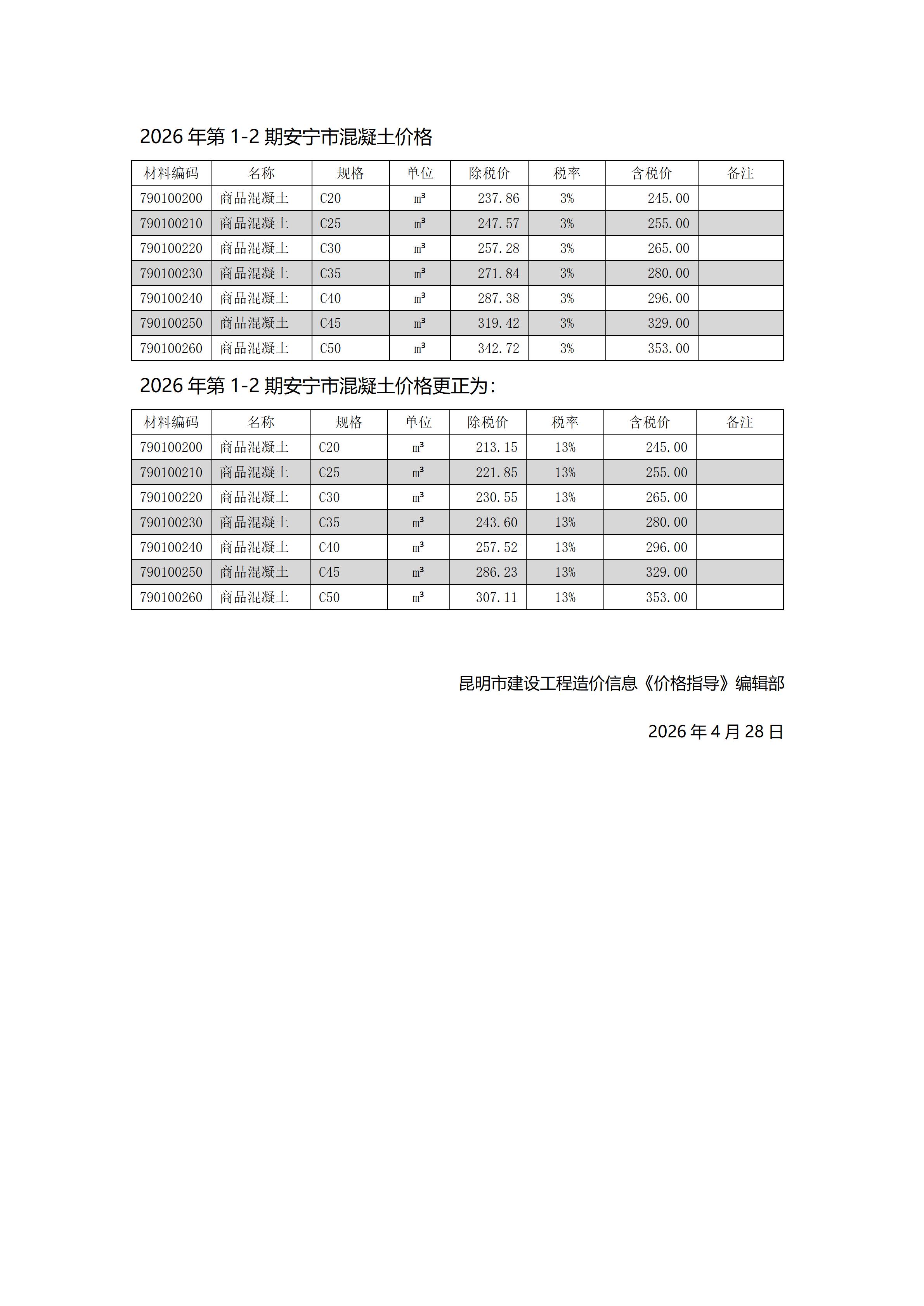 2026年第1-2期《昆明市建设工程材料及设备价格指导》安宁市混凝土价格勘误